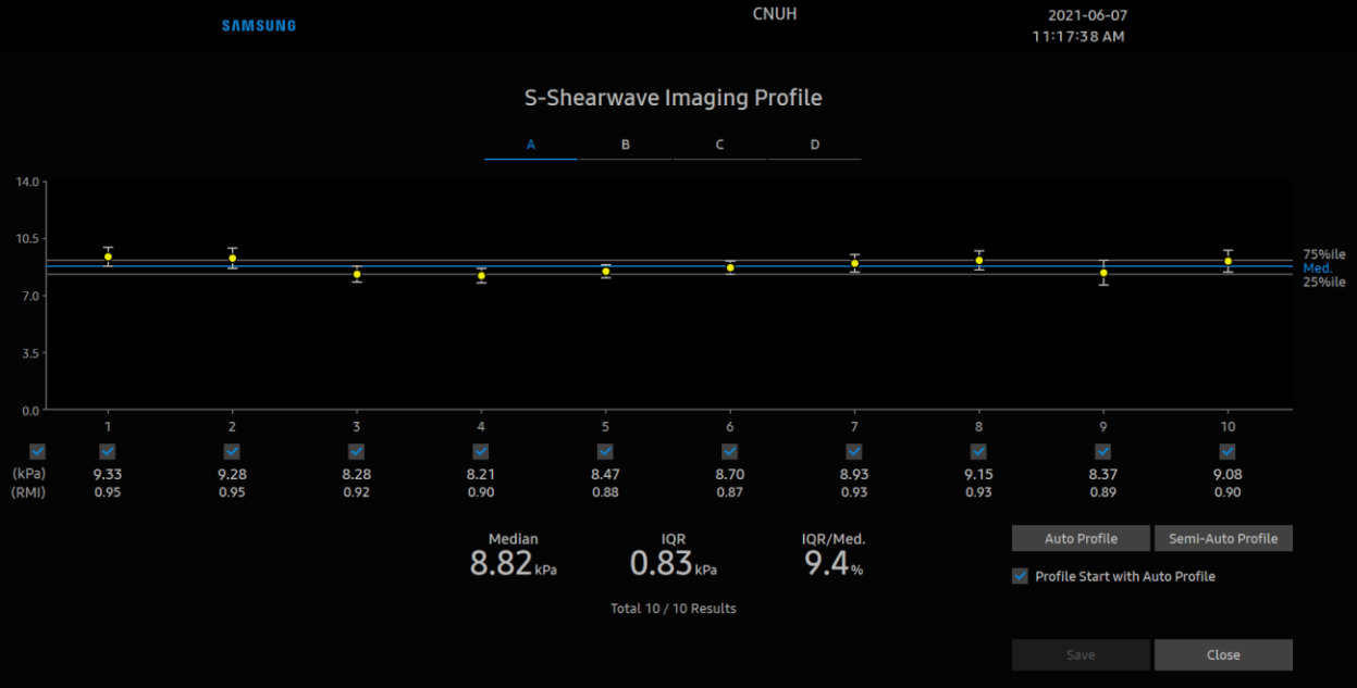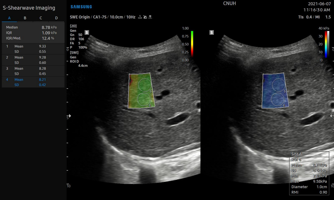 Особенности метода делают SWE портативным и выполнимым в различных клинических условиях. Так, современные ультразвуковые системы способны проводить эластографию печени (сдвиговой волны) с высокой точностью. Например, в УЗ системах Samsung функция эластографии называется 2D-SWE (S-Shearwave Imaging). Было установлено, что пороговые значения для диагностики начального фиброза, прогрессирующего фиброза и цирроза печени, составляют 6,82 kPa при ≥ F2, 8,63 kPa при ≥ F3 и 9,66 kPa при F4 соответственно. Данные значения актуальны только для систем Samsung..jpg?1683706893287)