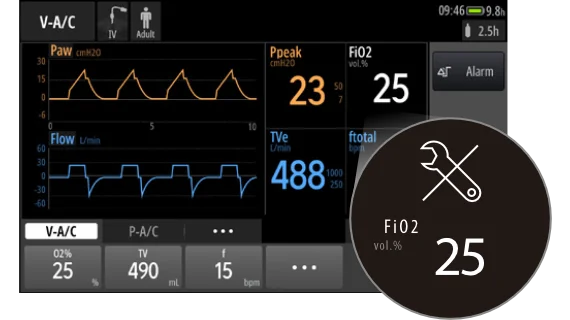 • Точная регулировка FiO2 в диапазоне от 21% до 100%