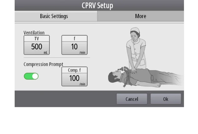 - Режим экстренной вентиляции CPRV, быстрый доступ к предварительно настроенным параметрам вентиляции CPR нажатием одной кнопки для оптимизации более безопасного процесса реанимации