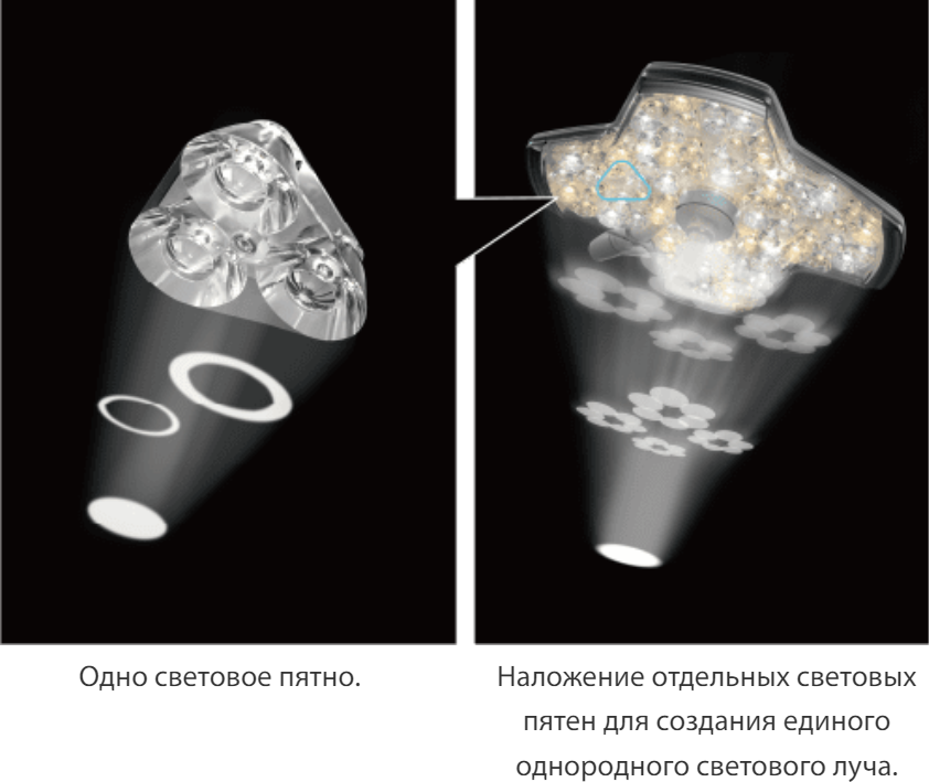 В серии HyLED X используется новая технология наложения световых пятен (Multi-patch Superposition Technology, MPST), которая обеспечивается посредством инновационной группировки линз для создания чистого и однородного светового поля, даже когда освещение перекрыто на 80%. Светильник состоит из 24 групп линз. Каждая отдельная группа образует целостное световое пятно и совмещается с другими, чтобы создать однородный световой луч в операционном поле.