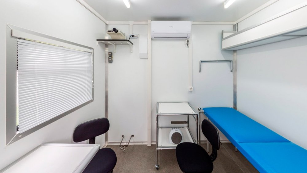 - Лабораторный и диагностический кабинеты оснащены всем необходимым специализированным медицинским оборудованием для профилактических осмотров населения. Для защиты от вибрационных и транспортных нагрузок, вся мебель и медицинское оборудование при перевозке надежно фиксируется.