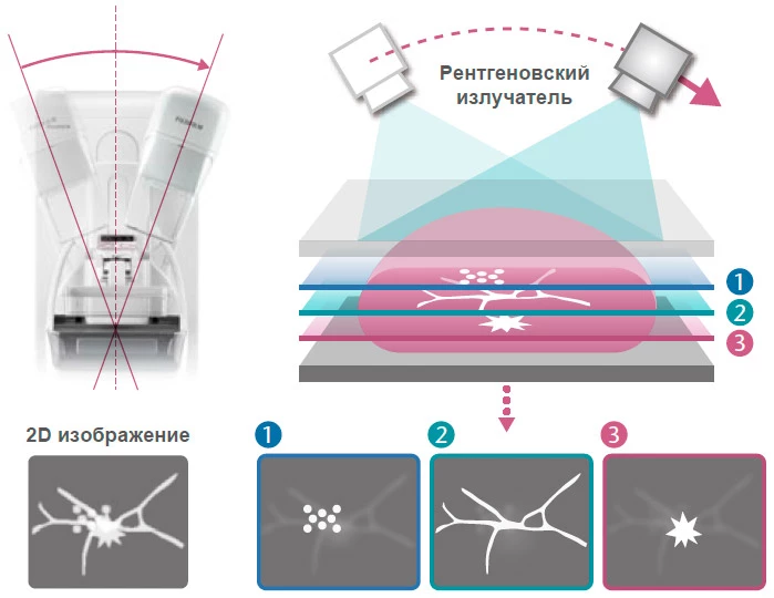 Возможность визуализации внутренней структуры при помощи серии изображений, полученных под разными углами, реконструируемых в набор томографических срезов, упрощающих выявление поражений молочной железы