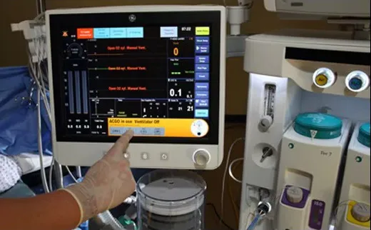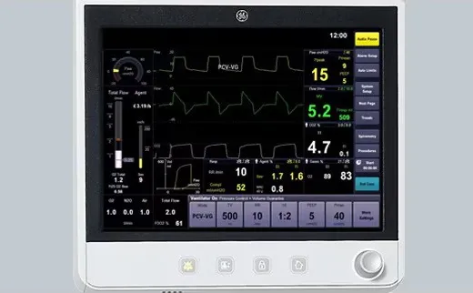 15-дюймовый сенсорный дисплей  Простой и удобный в использовании 15-дюймовый сенсорный дисплей аппарата искусственной вентиляции легких с интуитивно понятным интерфейсом CARESCAPE