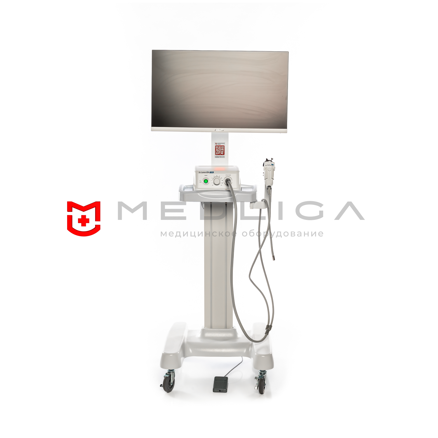 При помощи трехколесного основания штатив для фиксации камеры легко перемещается на необходимое расстояние, что позволяет устанавливать его в определенном положении рядом с любым гинекологическим креслом и получать на мониторе изображения одновременно выполнять различного рода процедуры: биопсию тканей, прижигание, орошение и т.д.