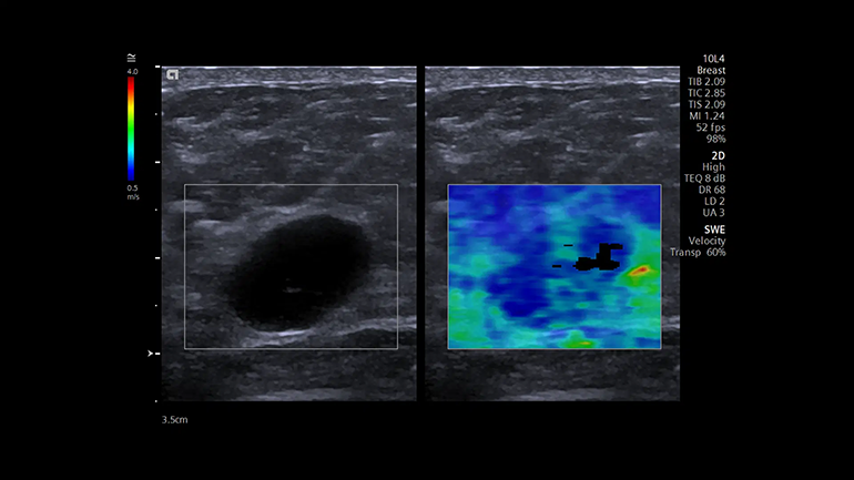 Технология для определения скорости распространения поперечной волны при работе с линейными и конвексными датчиками. Двумерная эластография со сдвиговой волной (SWE). Это технология качественной и количественной диагностики, с помощью которой можно получить цветовые карты жесткости тканей молочной и щитовидной желез, используя для этого датчик 10L4, а также конкретные цифровые значения скорости распространения поперечной волны.