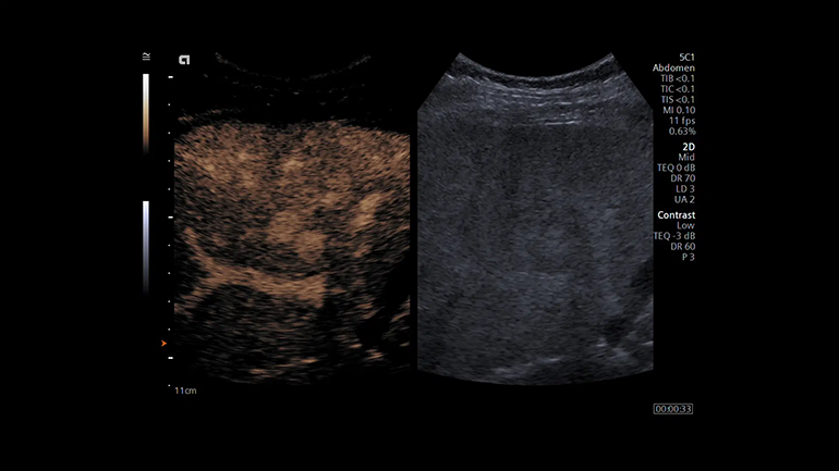 УЗИ с контрастным усилением (CEUS) с помощью визуализации с контрастным веществом. Технология импульсных последовательностей контрастного усиления эхо-сигнала от микропузырьков контрастного препарата (CPS) и технология коротких импульсов с большим механическим индексом позволяют более уверенно диагностировать очаги поражения печени.